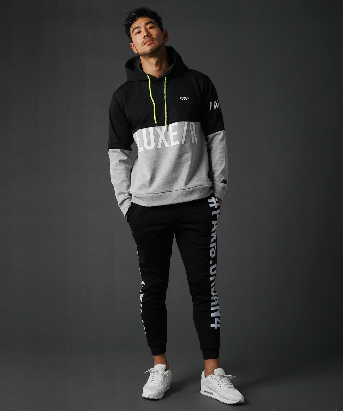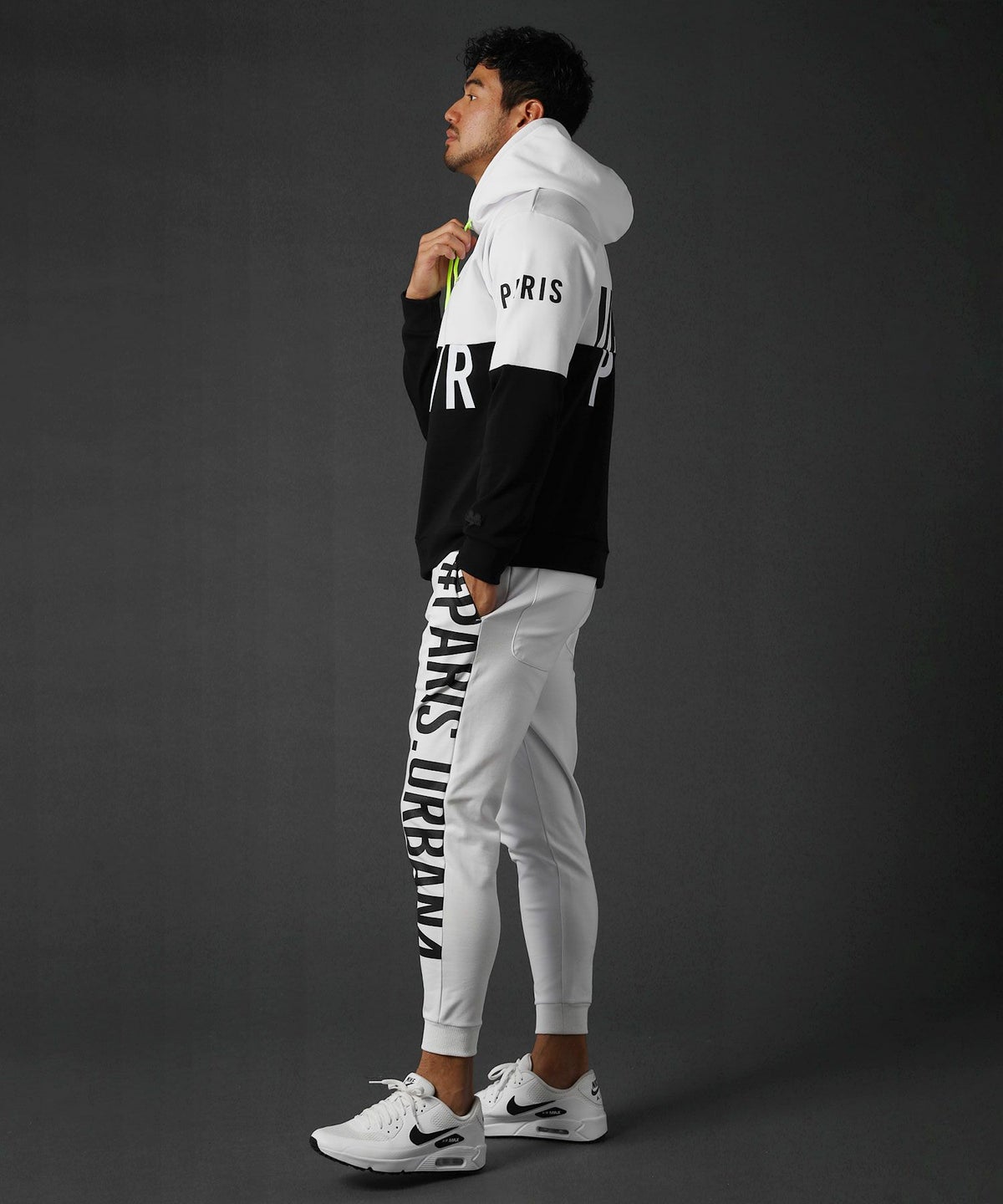 ヒップポケットに押されたラバー製のマークや、ネオンカラーの紐に施されたプリント加工など、どの角度から見てもインパクトを加えてくれます。