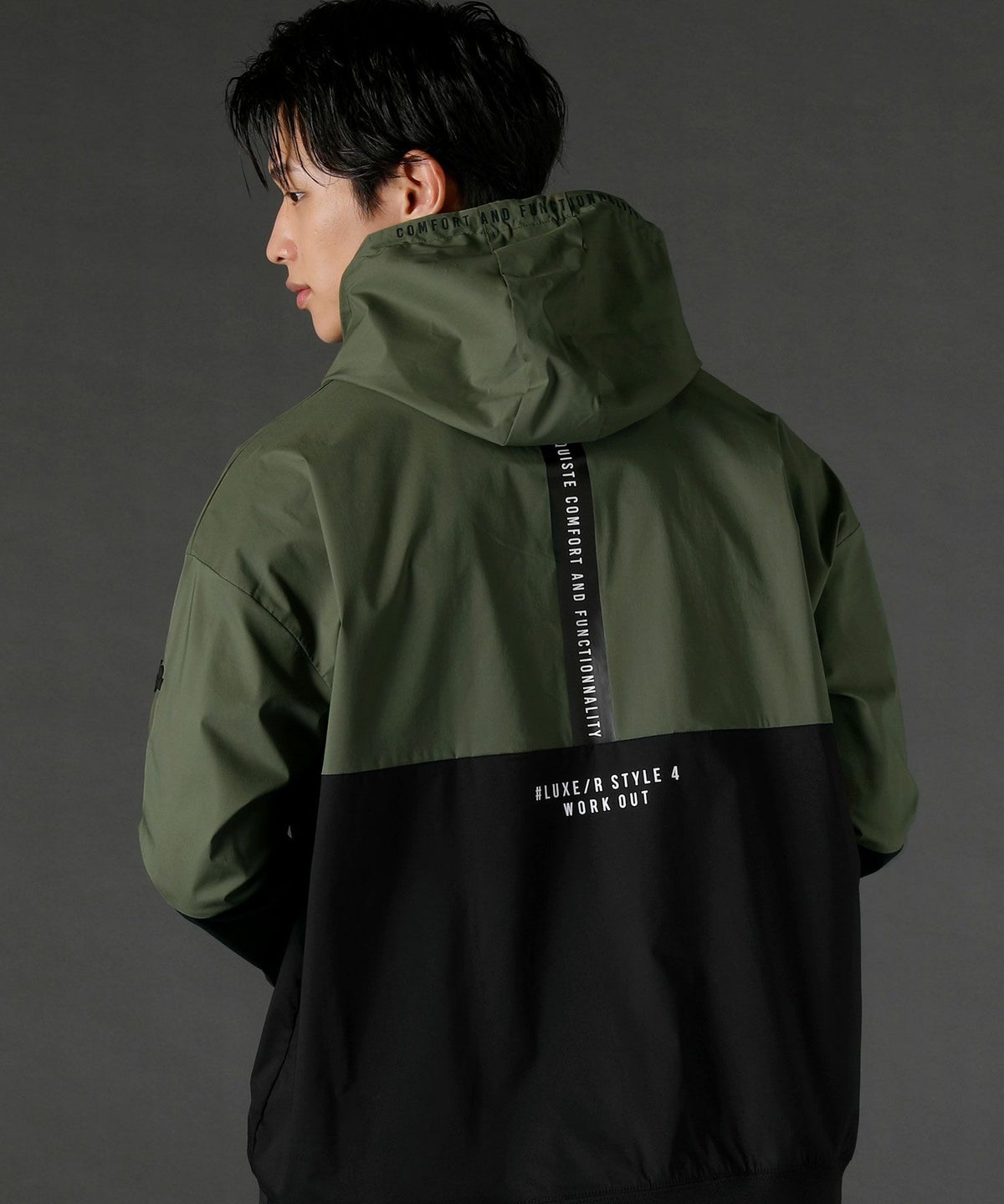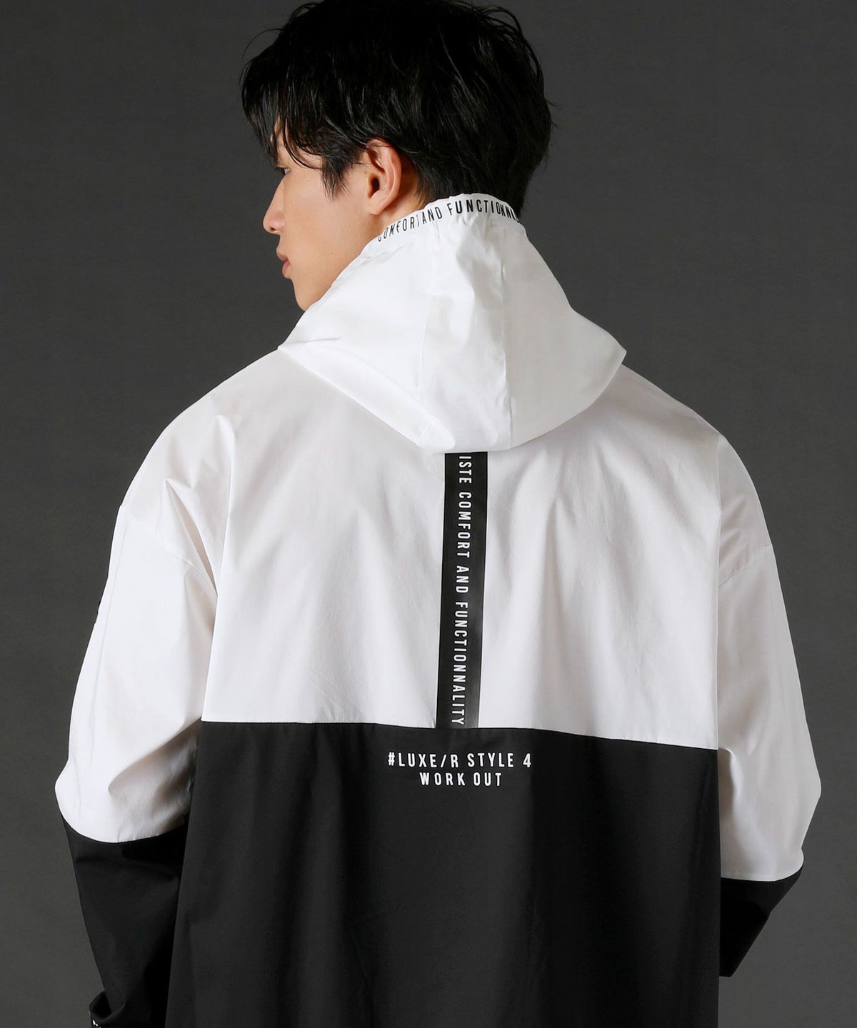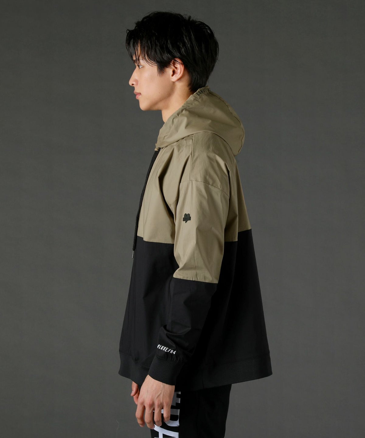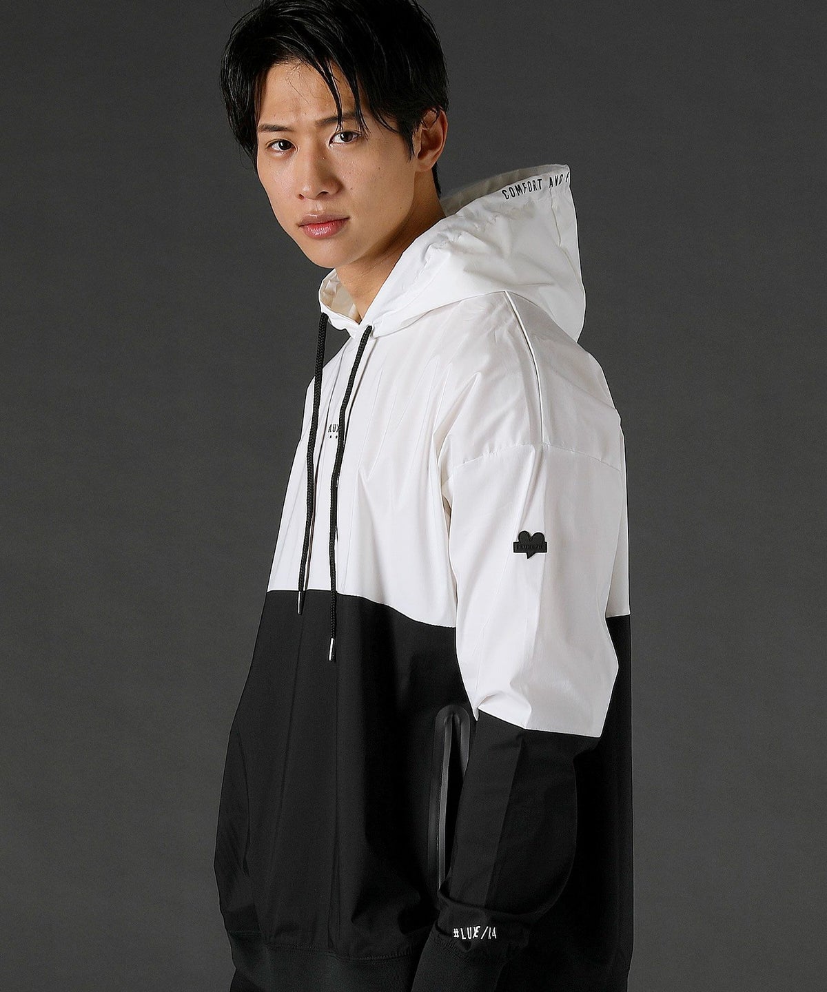 ボディの上下を切り替えたバイカラーは遠くからも映えるデザインポイント。フロントや左腕のロゴプリントとスタンプ風ラバープリントのロゴや背面にはバックプリント、フードの縁には英字プリントが施しました。随所にデザイン性が散りばめられたファッショナブルなアイテムです。