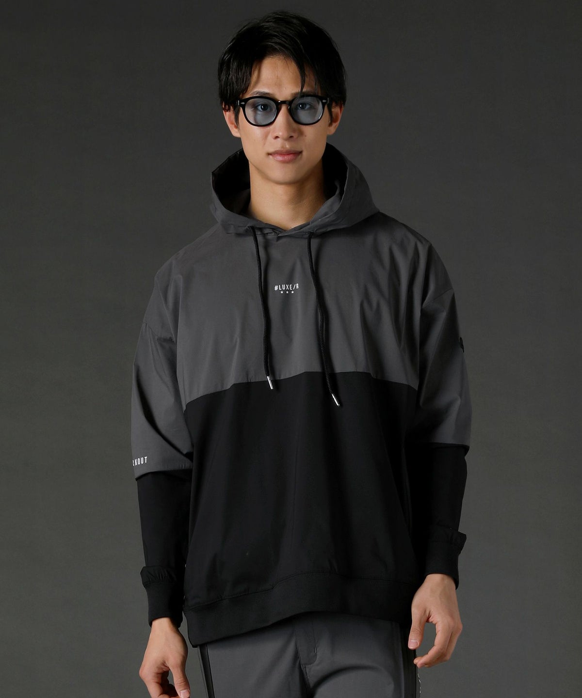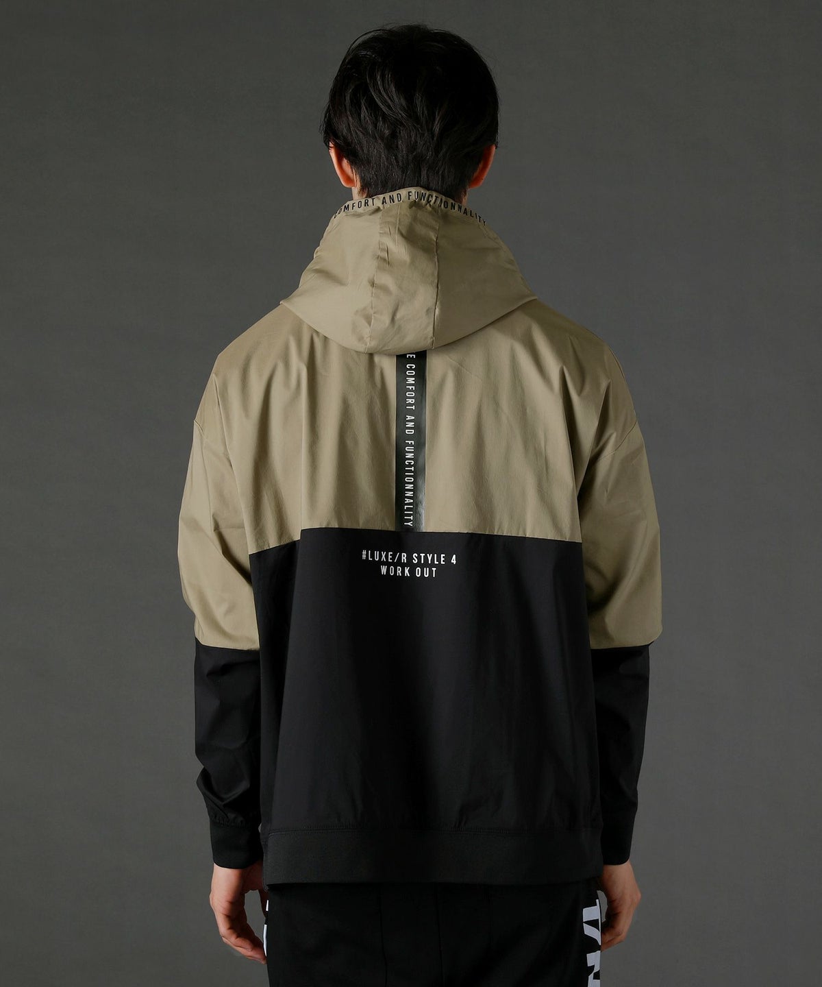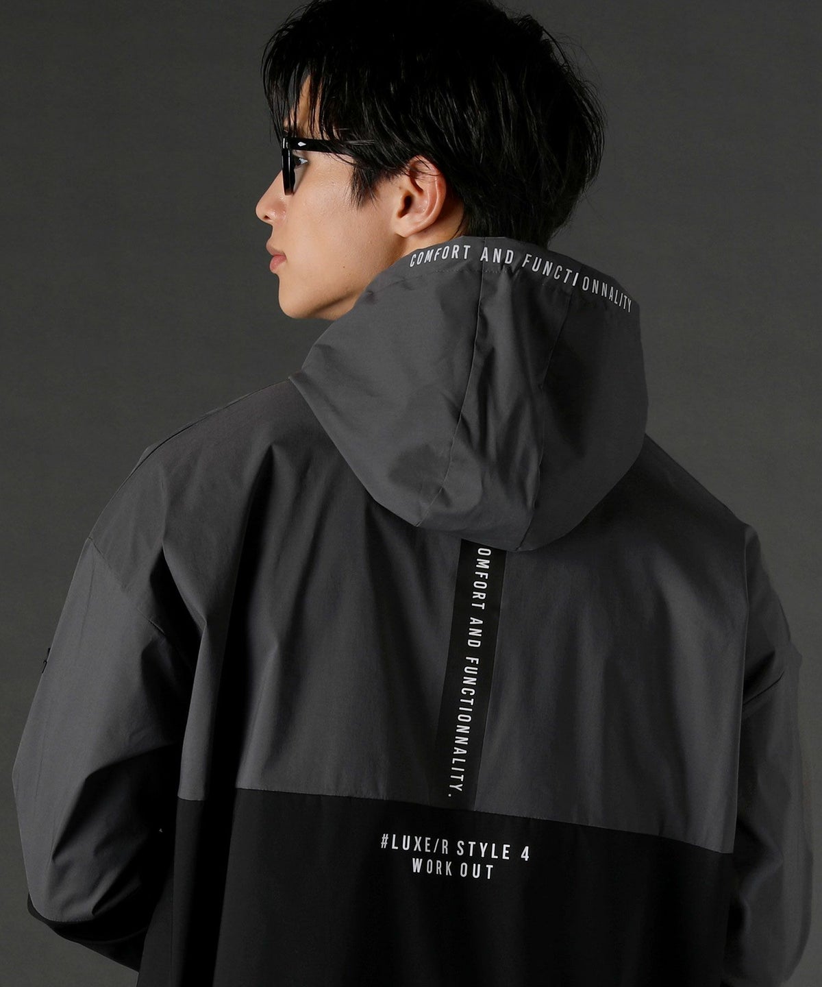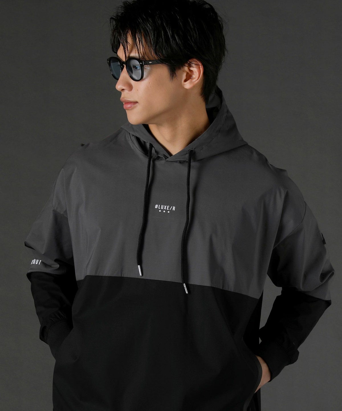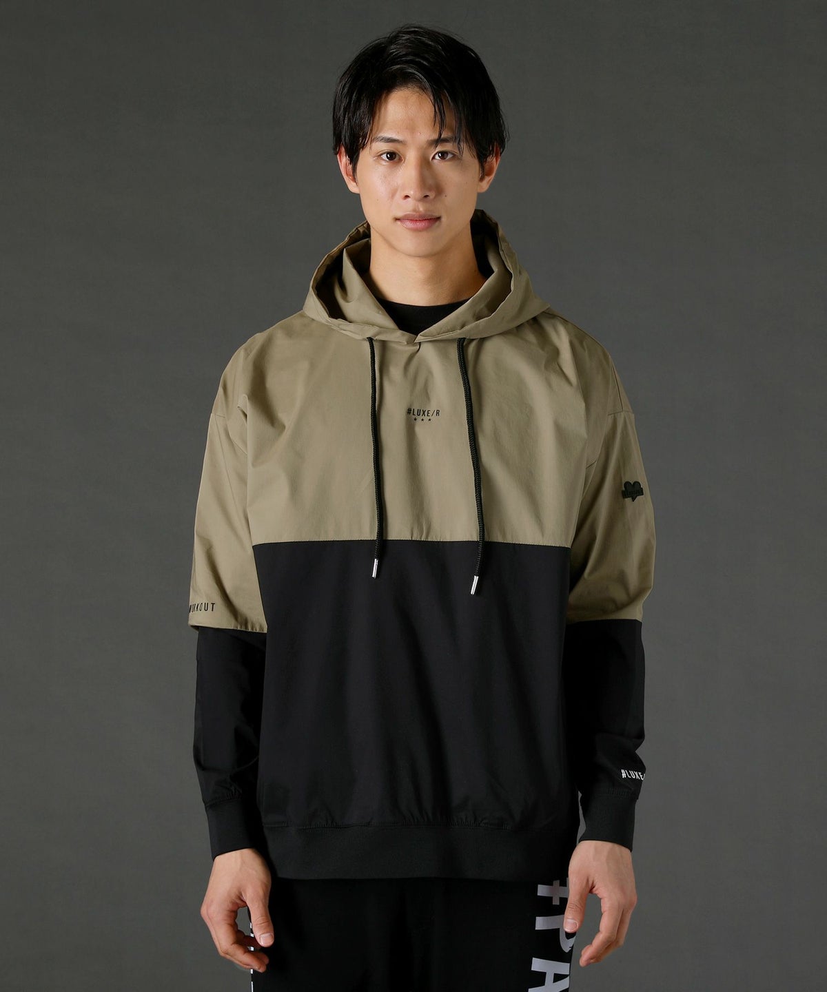 ボディの上下を切り替えたバイカラーは遠くからも映えるデザインポイント。フロントや左腕のロゴプリントとスタンプ風ラバープリントのロゴや背面にはバックプリント、フードの縁には英字プリントが施しました。随所にデザイン性が散りばめられたファッショナブルなアイテムです。