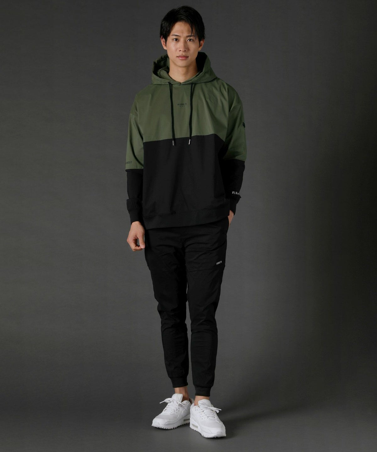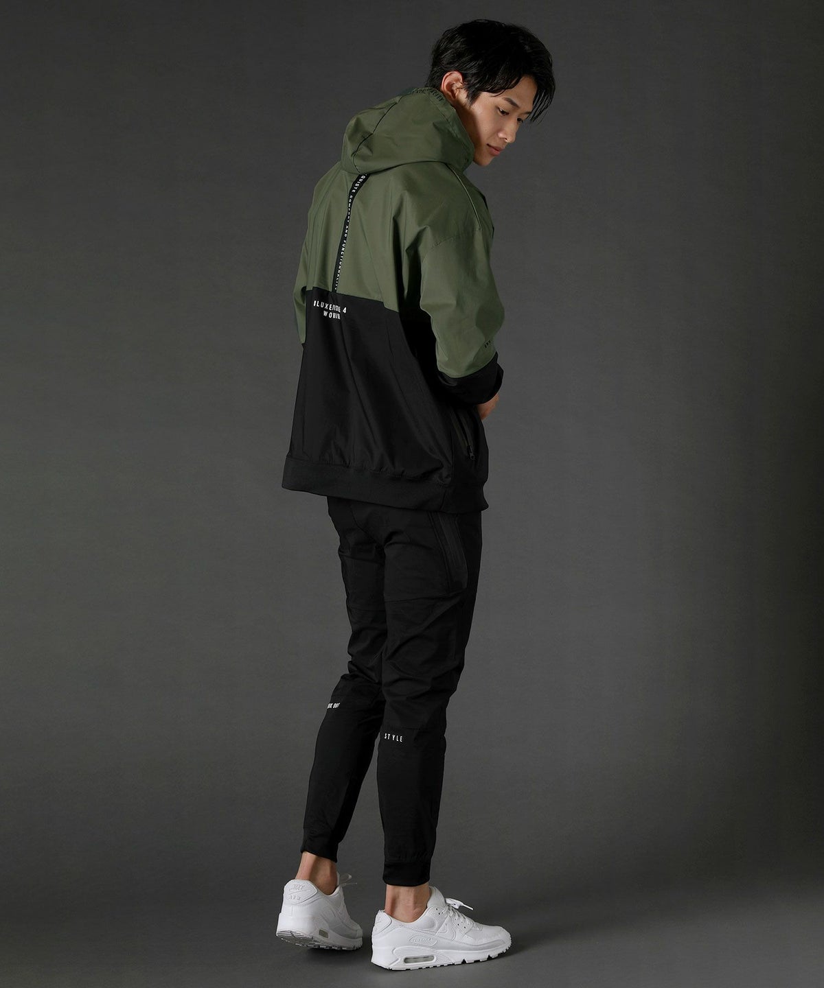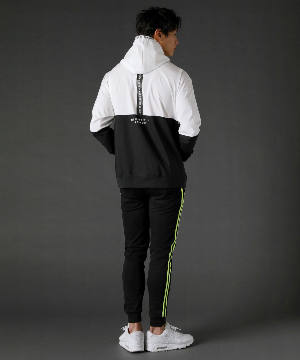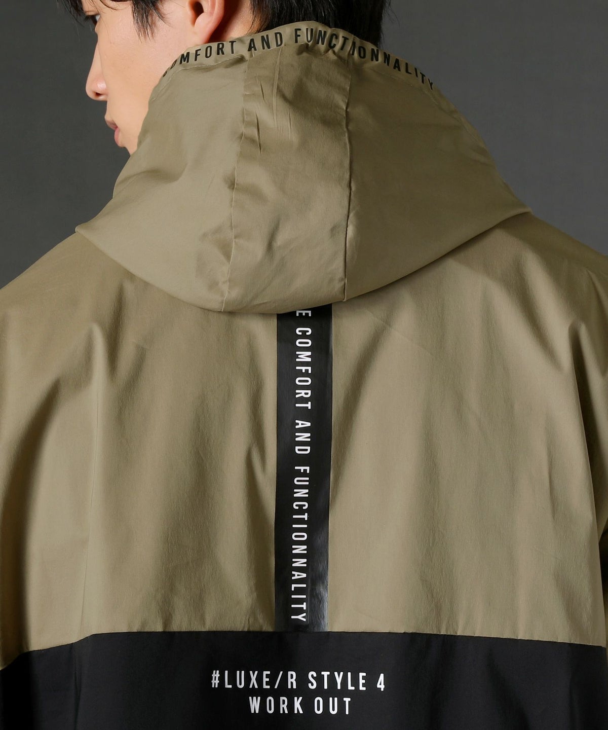 ボディの上下を切り替えたバイカラーは遠くからも映えるデザインポイント。フロントや左腕のロゴプリントとスタンプ風ラバープリントのロゴや背面にはバックプリント、フードの縁には英字プリントが施しました。随所にデザイン性が散りばめられたファッショナブルなアイテムです。