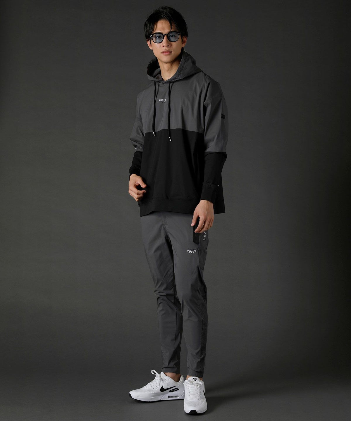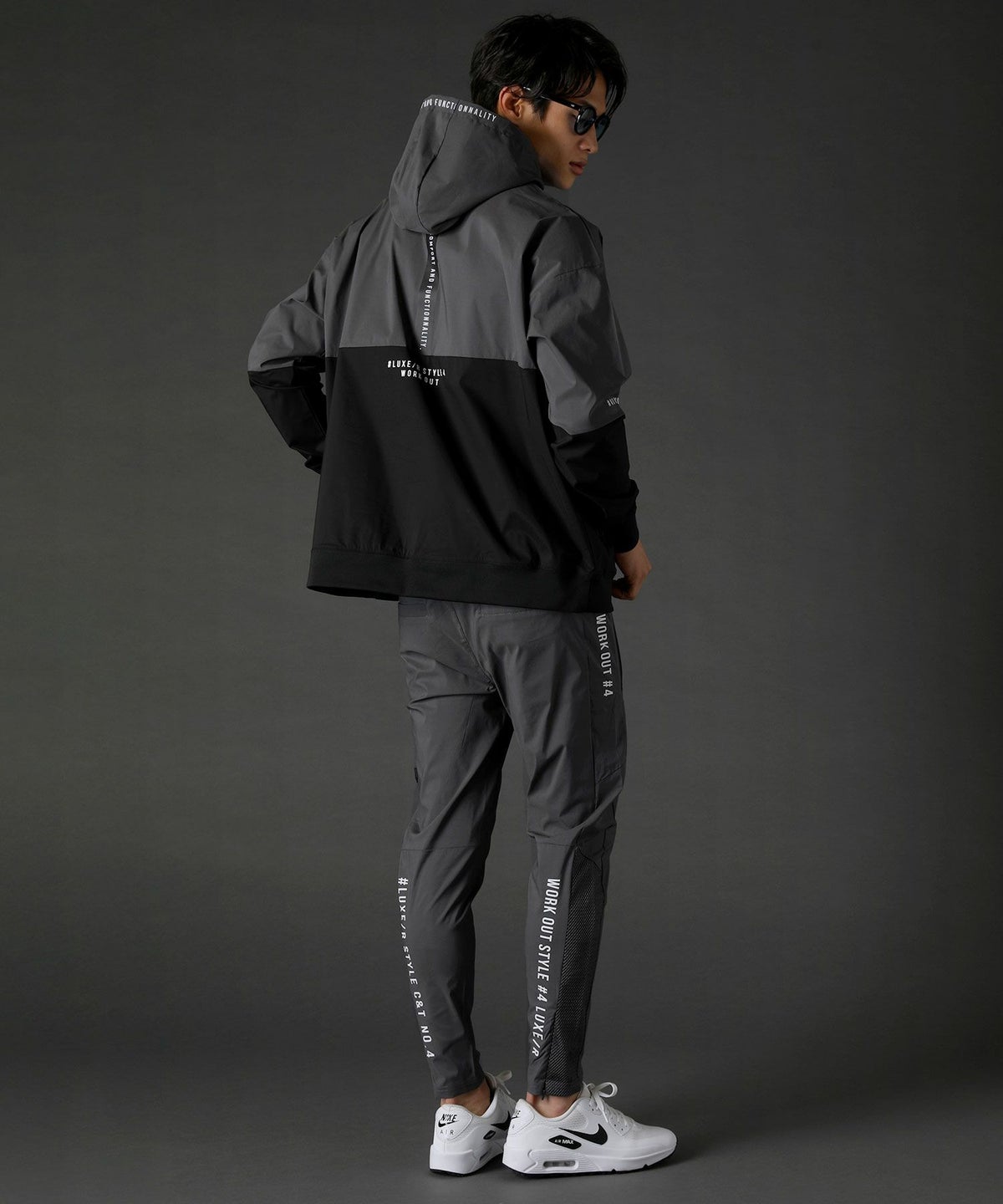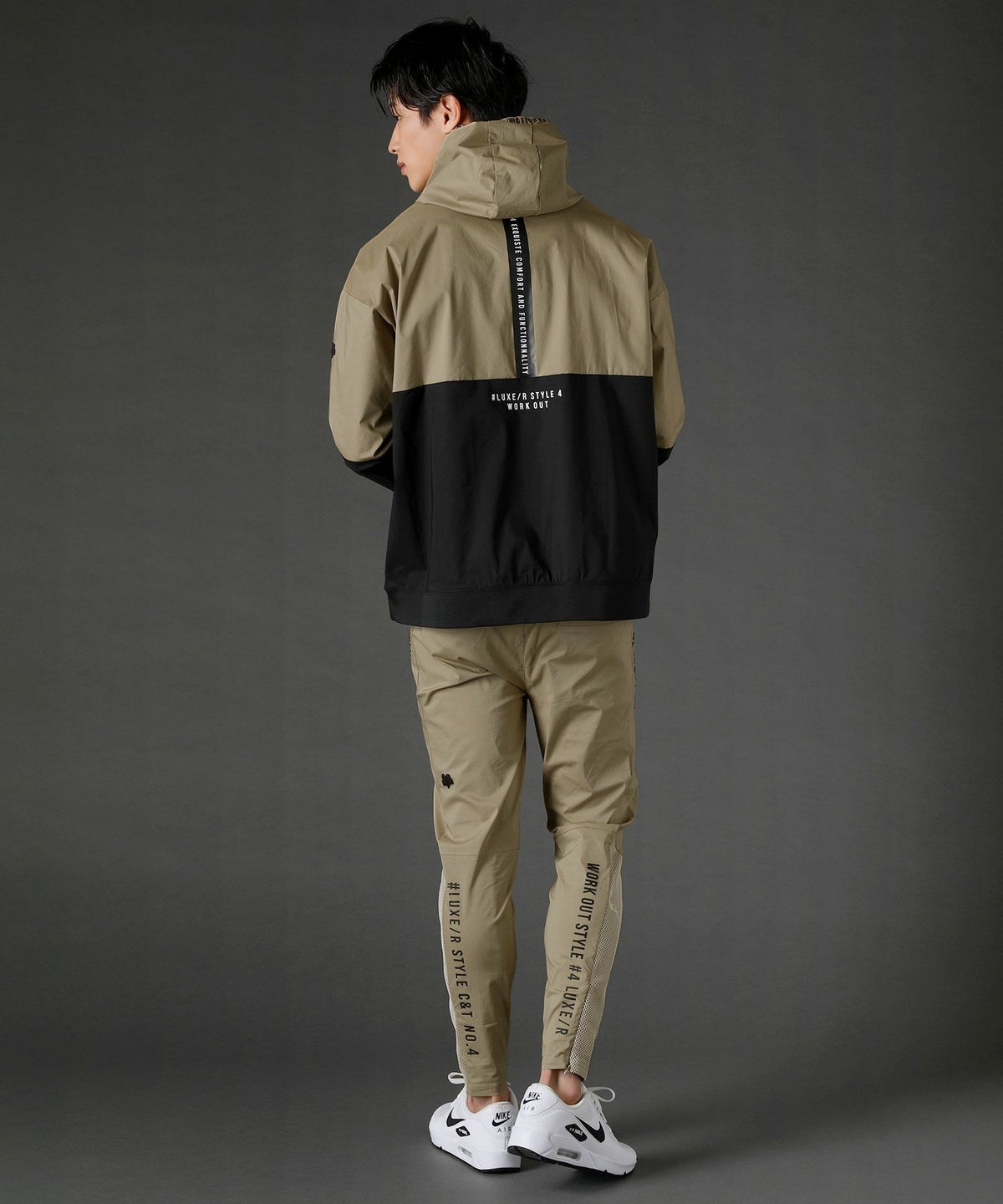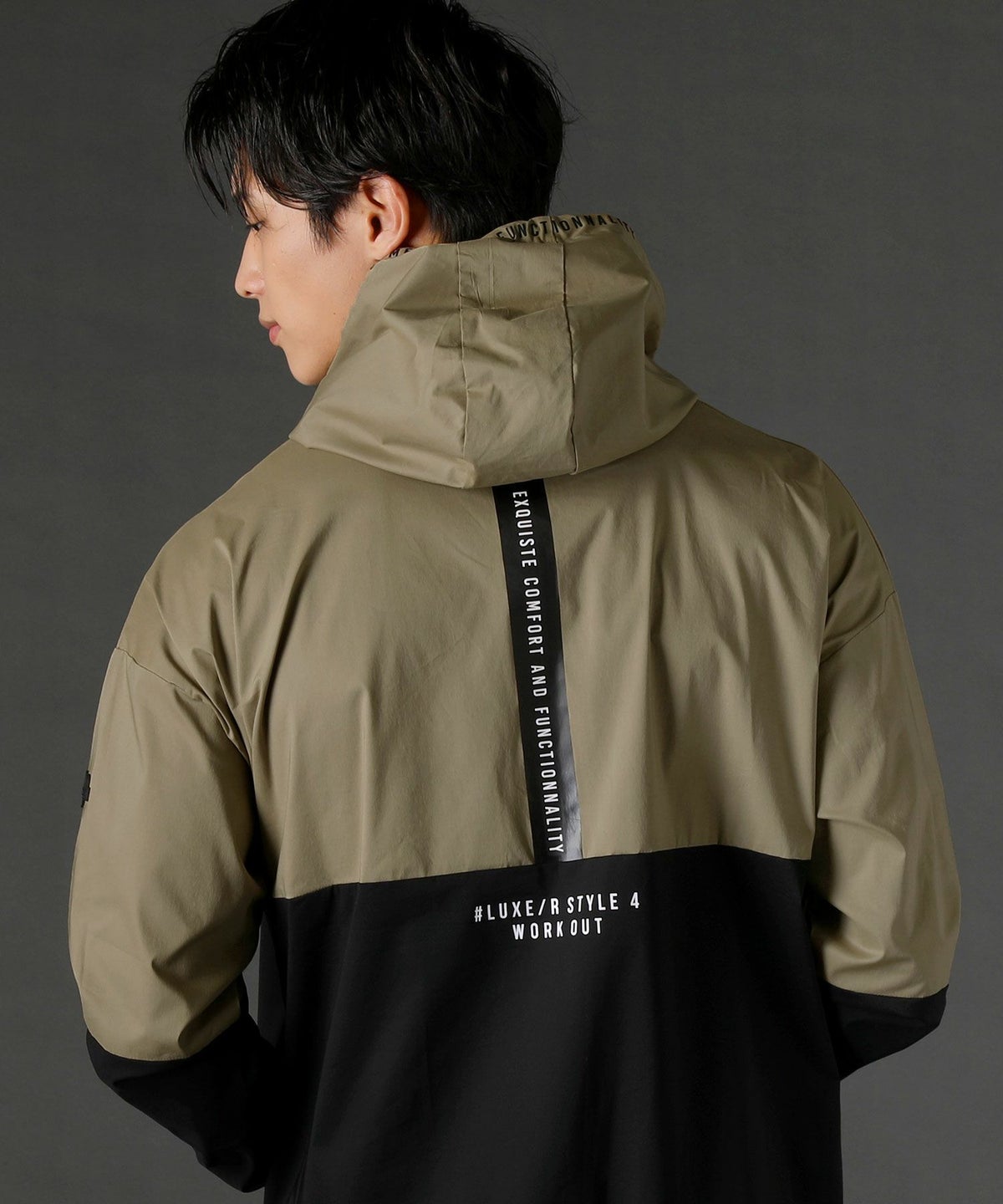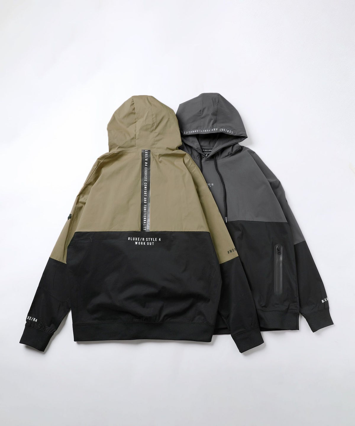 ボディの上下を切り替えたバイカラーは遠くからも映えるデザインポイント。フロントや左腕のロゴプリントとスタンプ風ラバープリントのロゴや背面にはバックプリント、フードの縁には英字プリントが施しました。随所にデザイン性が散りばめられたファッショナブルなアイテムです。
