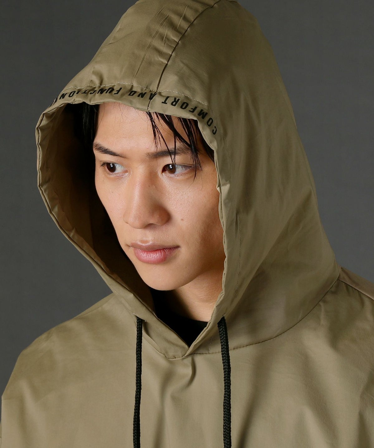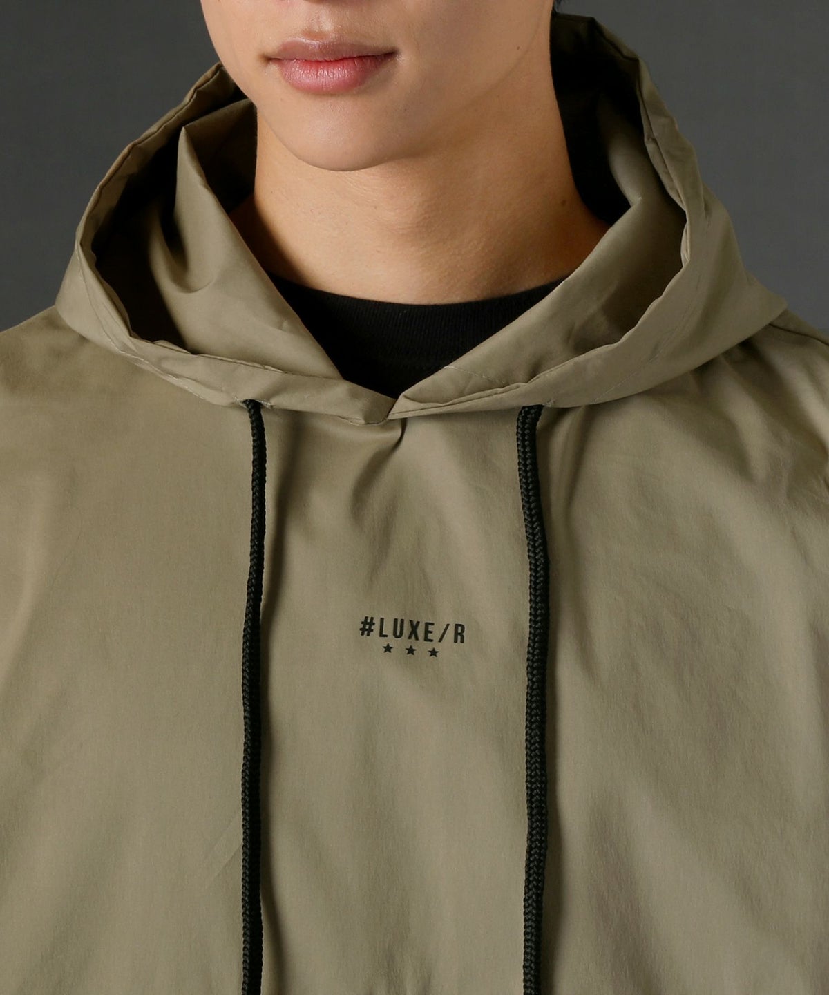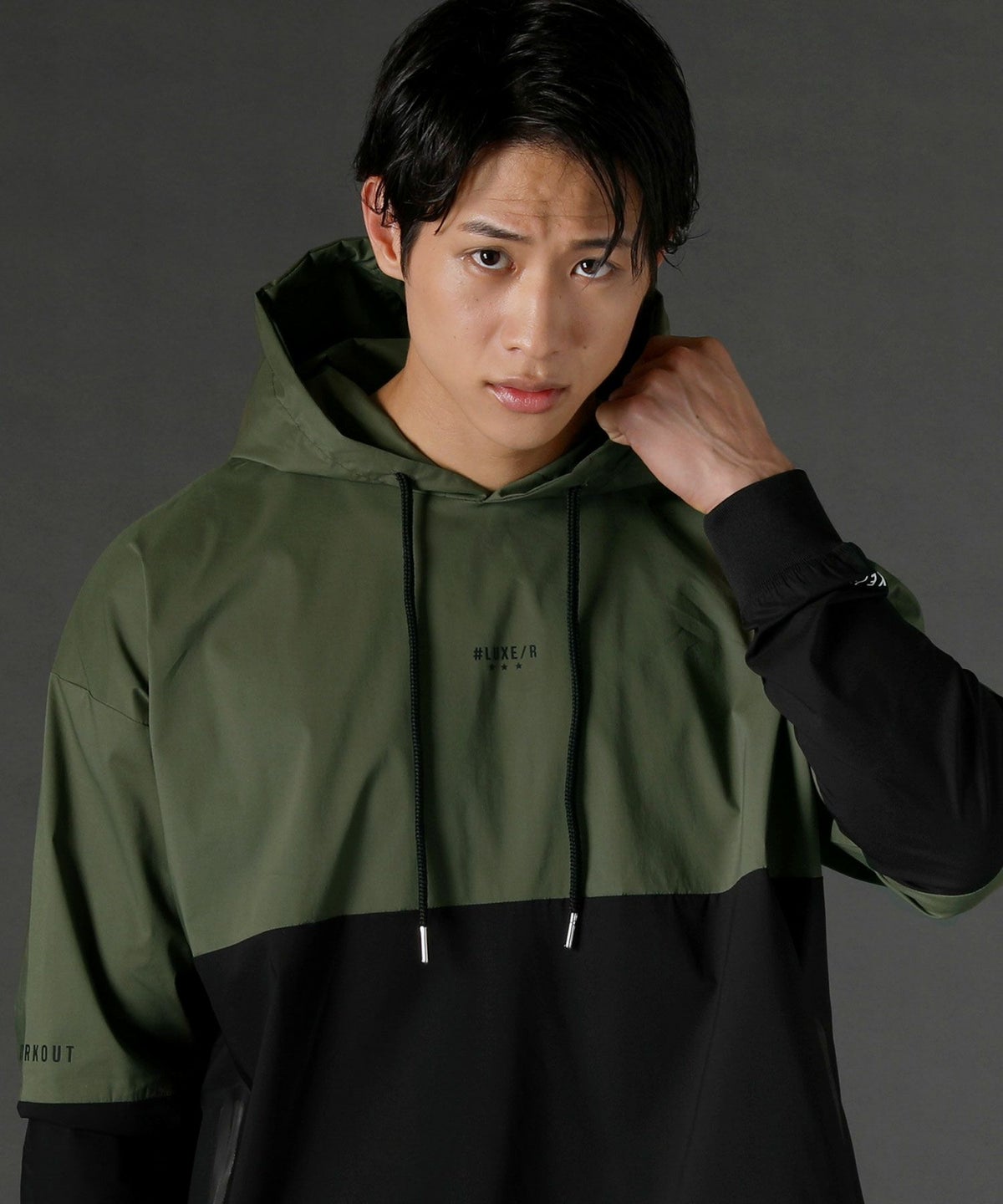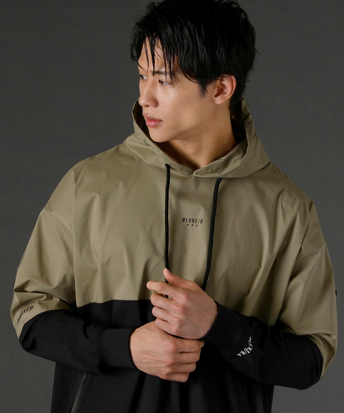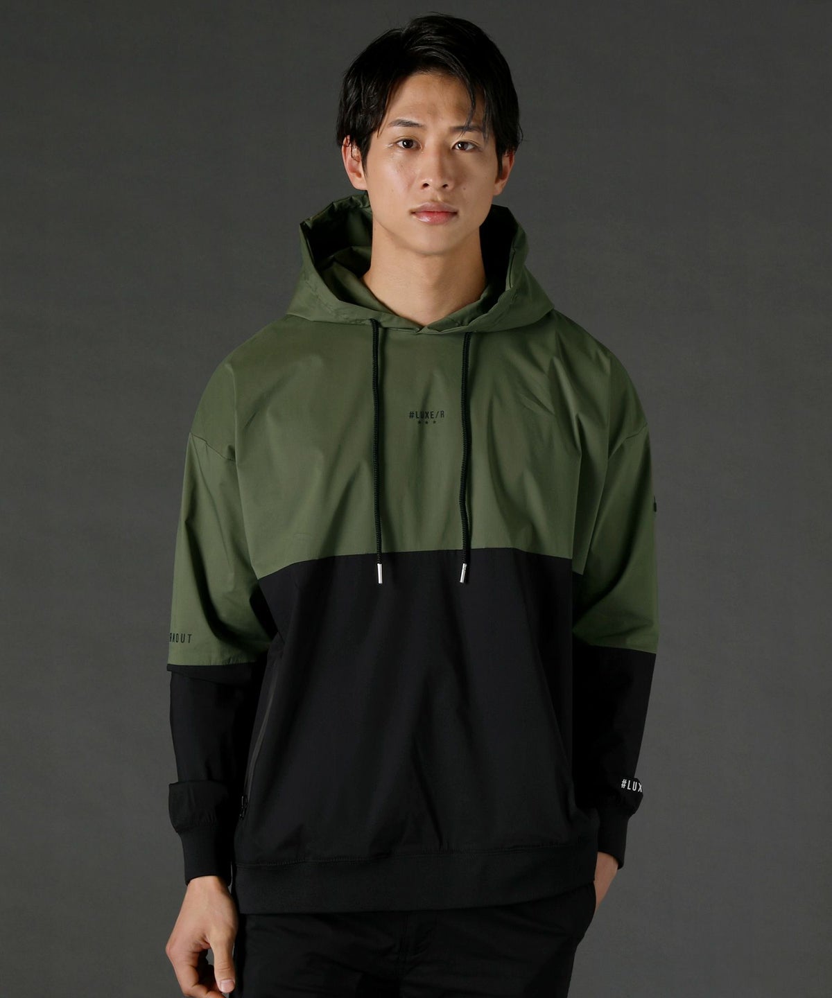 5. ストレッチ布帛長袖バイカラープルパーカー