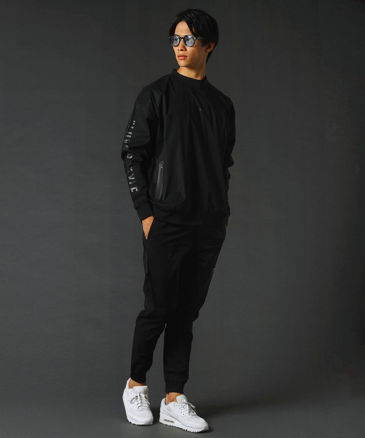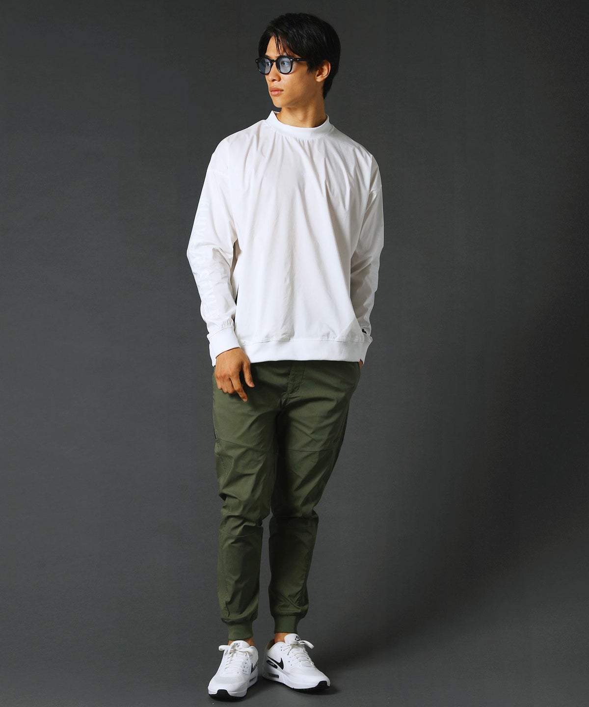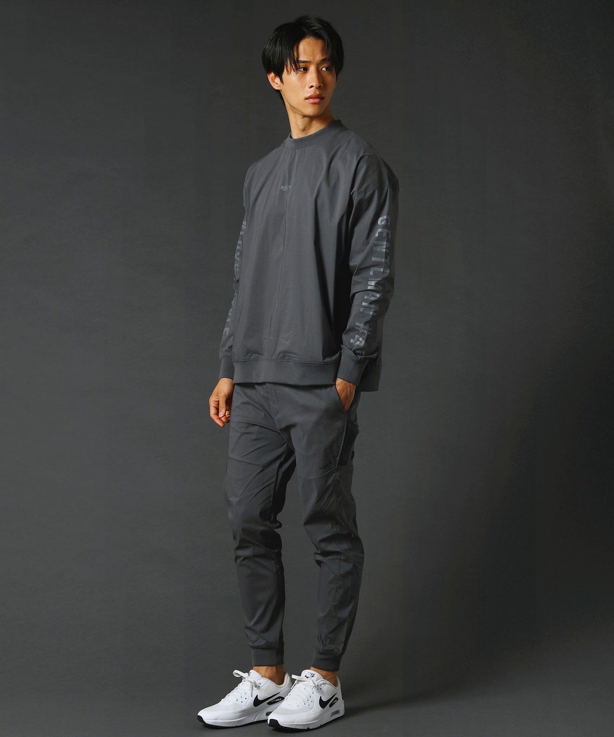 撥水ストレッチ布帛ロゴ入りリブハイネック長袖プルオーバー