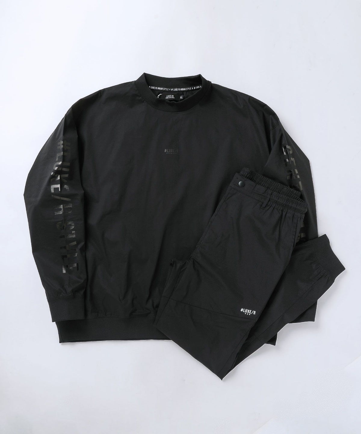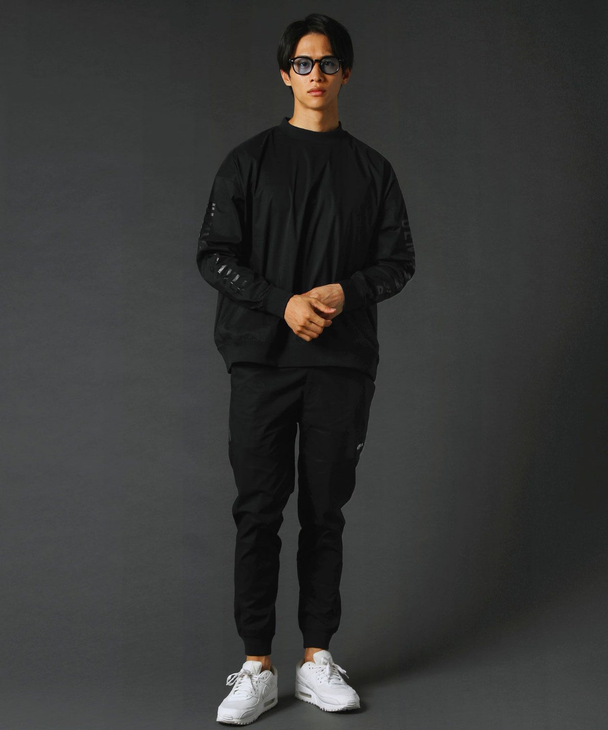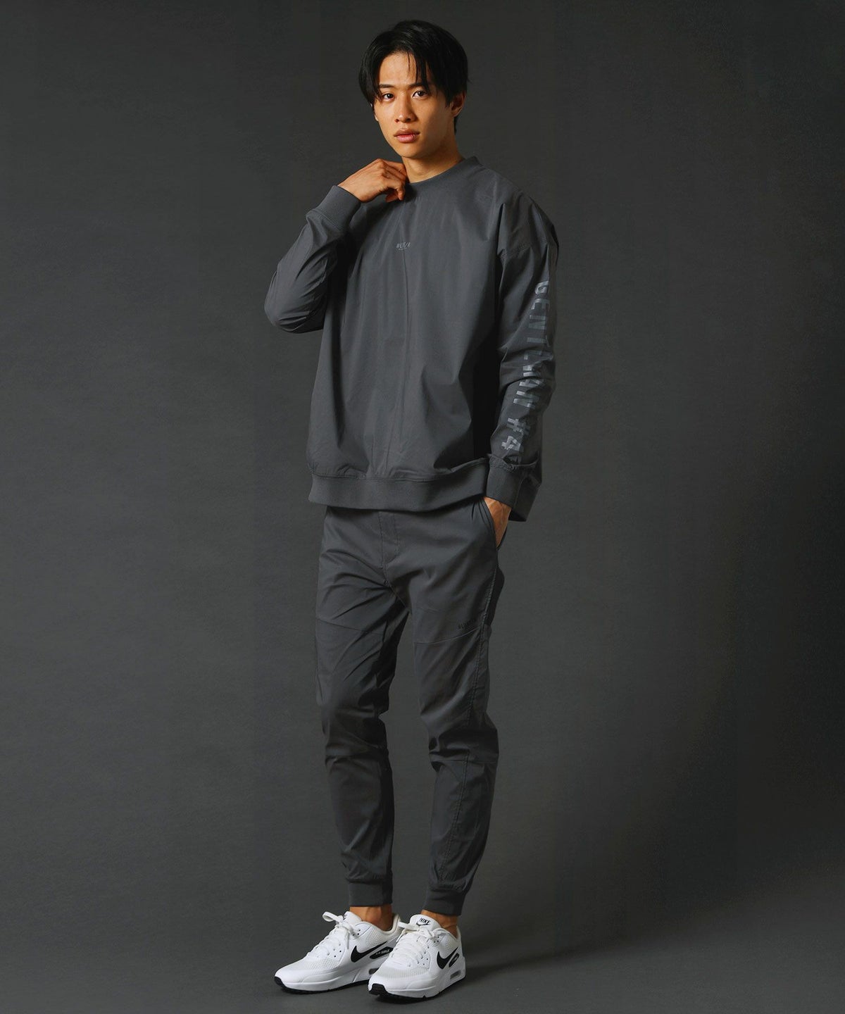 撥水ストレッチ布帛ロゴ入りリブハイネック長袖プルオーバー